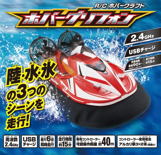トイラジコン商材の中でも希な存在であるホバークラフトR/Cが装いも新たにリニューアル!陸を、水上を、氷上を、赤い疾風が駆け回る!「R/Cホバークラフト ホバーグリフォン」登場!水に浮かび疾走するホバークラフト性能はそのままに、子供に人気のレッドカラーボディとなって新発売します。ホバークラフトはタイヤと違って風力による走行なので、前進・後進はもちろん、回転・ドリフト、また水上、氷上、雪道など、通常のR/Cでは出来ないアメージングな走行が楽しめます。また2.4GHzなので、屋内でも屋外でも遊ぶことができます。