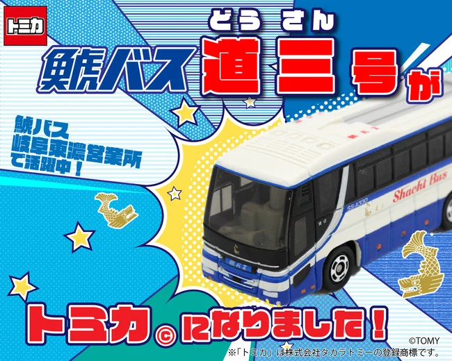 名古屋・岐阜・静岡で貸切観光バス、バスツアーなどを営む鯱バス株式会社(本社:愛知県名古屋市、代表:宇津木 滋)は、鯱バス初のトミカ 鯱バス「道三」号の発売を10月1日より開始いたします。なお、今回のトミカ発売にあたっては、株式会社大垣共立銀行(本社:岐阜県大垣市 頭取;境 敏幸)の協力の元、岐阜ゆかりの車両をモチーフに制作を行っております。
