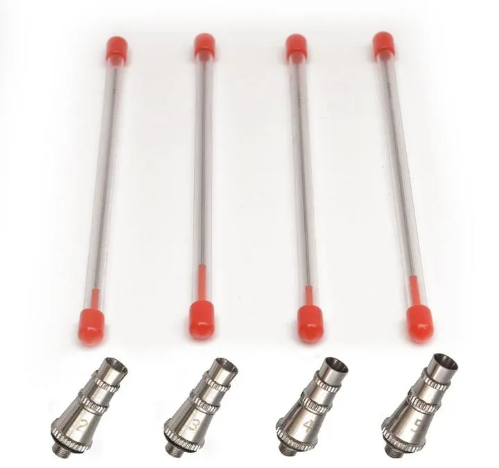 各口径の区別がしやすいように各ヘッドパーツ及びニードル後部に、