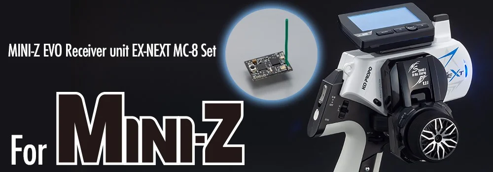 今回公開されたEX-NEXT用アップデートファイル はVer.2.00.00。EX-NEXTにこのアップデートファイルを書き込むことでMINI-Z EVOと通信できるようになる。組み合わせて使用するレシーバーは京商より発売されている「MINI-Z EVO レシーバーユニット EX-NEXT MC-8 82043」。また、EX-NEXTとレシーバーのセットも販売開始となる。