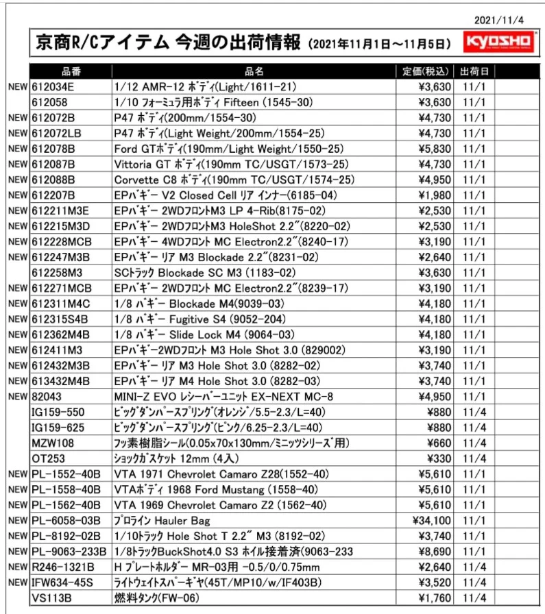 京商株式会社は「今週の出荷情報(2021年11月1日~11月5日)」 を発表いたしました。