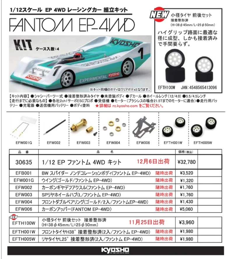 京商株式会社は1/12 電動4WDレーシングカー ファントム 4WD 再入荷 と小径タイヤの新発売を発表いたしました。
