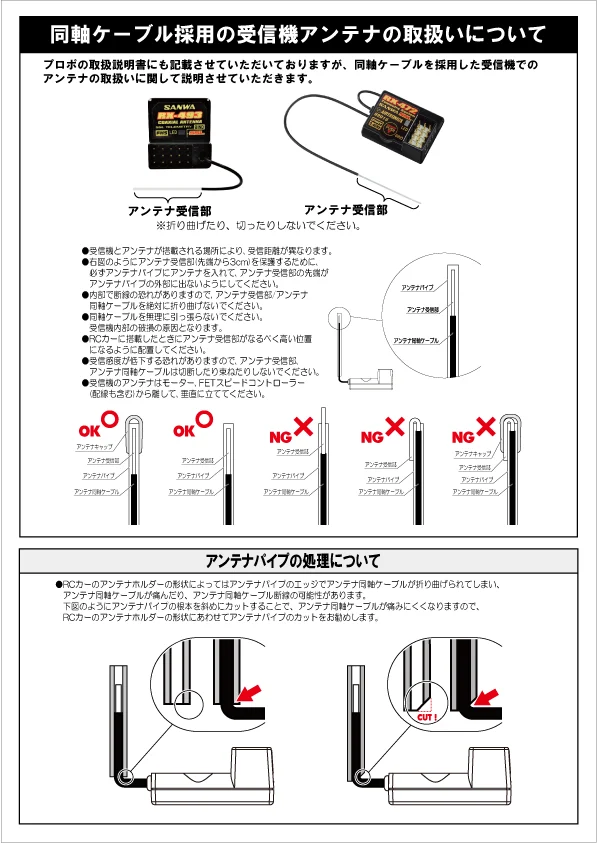 同社の同軸ケーブルを採用した受信機でのアンテナの取り扱いに関して、正しい取り扱いと注意点をまとめている。