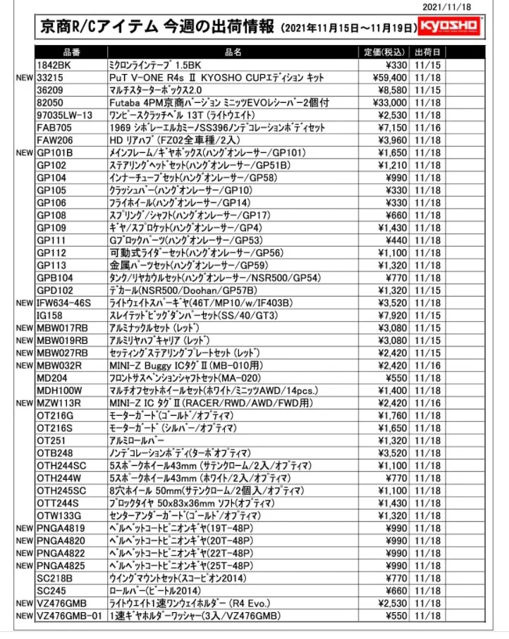 京商株式会社は「今週の出荷情報(2021年11月15日~11月19日)」 を発表いたしました。