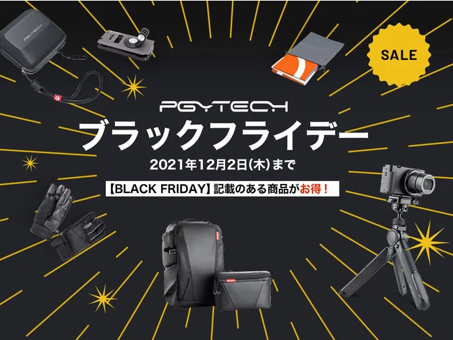 株式会社セキド(本社:東京都国立市、代表取締役:大下貴之)では、日本総代理店を務めるDJI製品や各種カメラ関連機器のアクセサリーパーツメーカー「PGYTECH(ピージーワイテック)」 の対象商品が 20%OFFとなる「PGYTECH ブラックフライデー」を12月2日(木)までの期間限定で開始した。