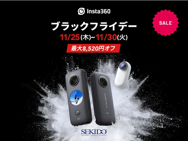株式会社セキド(本社:東京都国⽴市、代表取締役:⼤下貴之)では、2021年11月30日(火)までの期間、簡単な操作で周囲全ての映像を撮影できる360度超高画質アクションカメラ「Insta360 ONE X2(インスタ360 ワンエックス2)」が最大 8,520円OFF、27gの親指サイズで超広角動画が撮影できる「Insta360 GO 2(インスタ360 ゴー2)」が 2,000円OFFとなる Insta360 ブラックフライデー を開催中。