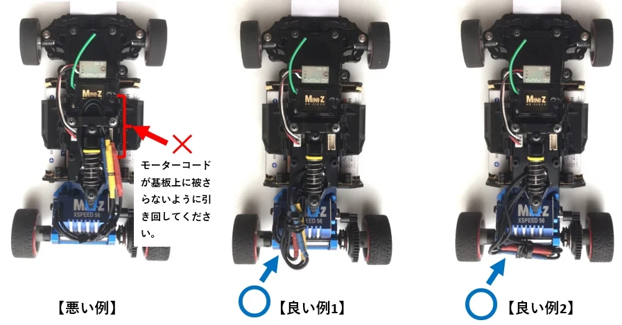 ①モーターコードの引き回しをご確認ください。下図のように、なるべくMR-03基板とレシーバーユニットから遠ざけるように配線してください。これにより、通信状態が改善する場合があります。