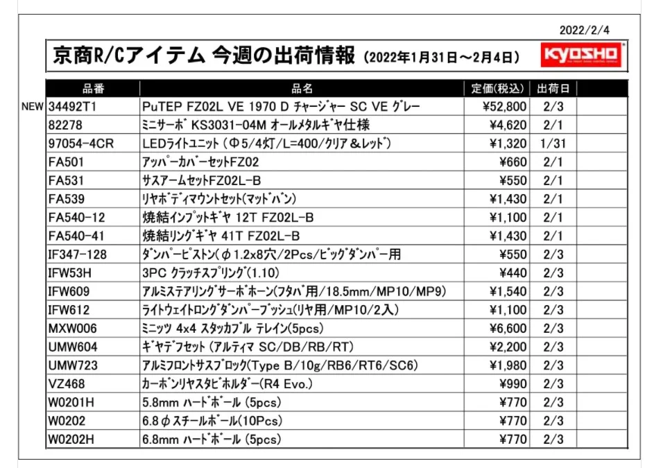 KYOSHO RC Information 今週の出荷情報(2022年1月31日~2月4日)