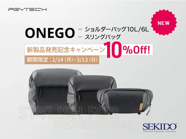 株式会社セキド(本社:東京都国立市、代表取締役:大下貴之)では、日々の手軽な撮影を楽しむためのカメラやドローン、スマートフォン、デジタルガジェットをスマートに収納するバッグシリーズ「PGYTECH OneGo ショルダーバッグ(ピージーワイテック ワンゴー ショルダーバッグ)」と「PGYTECH OneGo スリングバッグ(ピージーワイテック ワンゴー スリングバッグ)」の販売を 2月14日(月)より開始した。