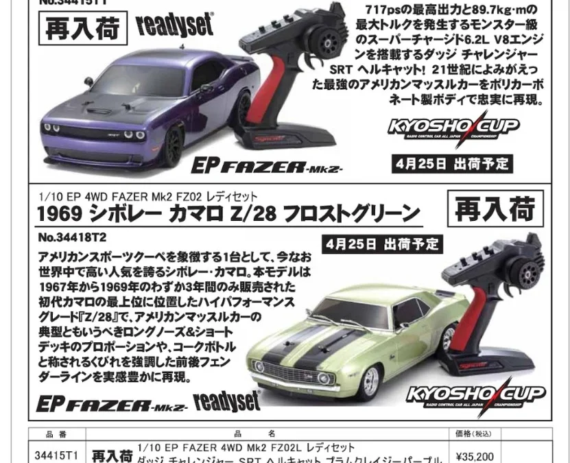 京商株式会社は「1/10 電動ツーリングカー FAZER Mk2 ダッジチャレンジャー&シボレーカマロ の再入荷」 を発表いたしました。