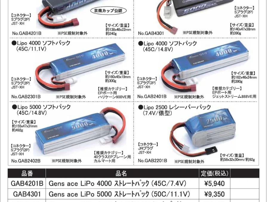 京商株式会社は「Gens ace LiPoバッテリー各種 再入荷と一部を除き価格変更 」 を発表いたしました。