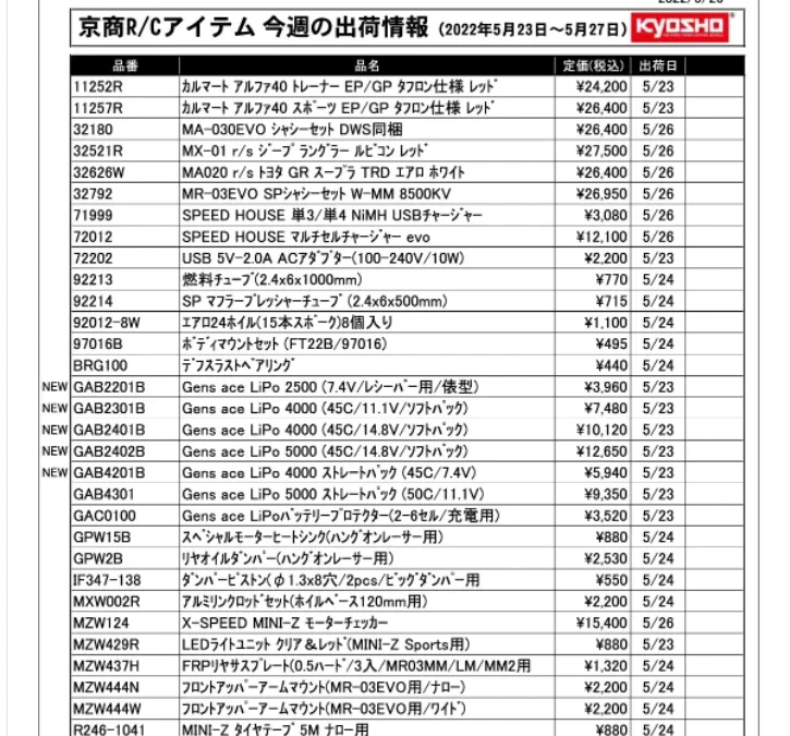 KYOSHO RC Information 今週の出荷情報(2022年5月30日~6月3日)