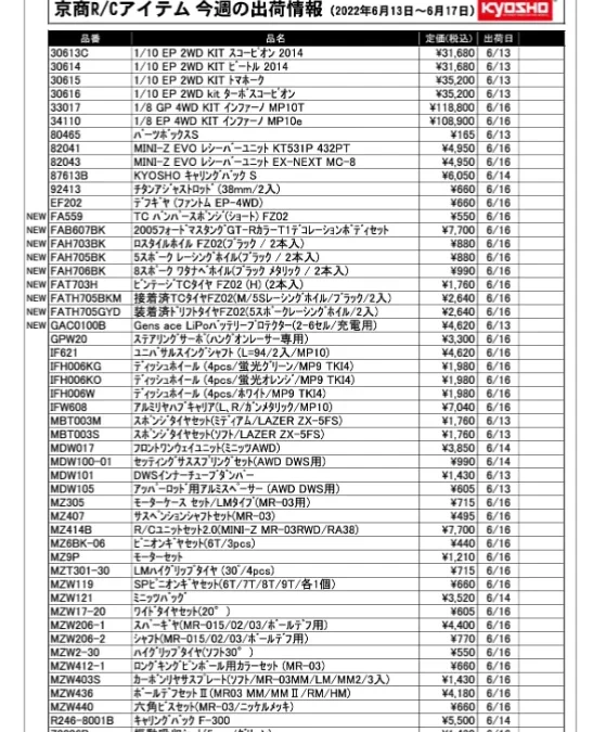 京商株式会社は「今週の出荷情報(2022年6月13日~6月17日)」 を発表いたしました。