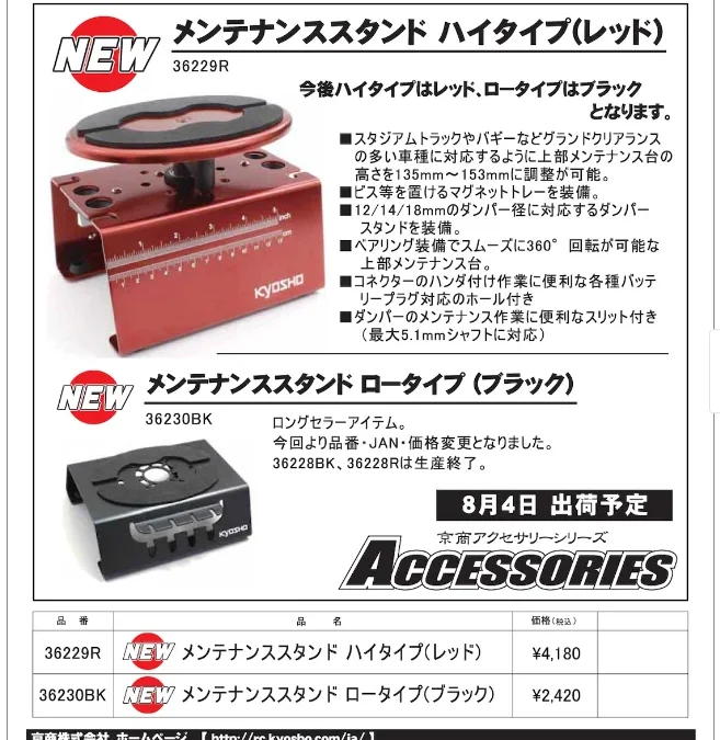 京商株式会社は「メンテナンススタンド ハイタイプ(レッド) 新登場 & ロータイプ(ブラック)再入荷!」 を発表いたしました。
