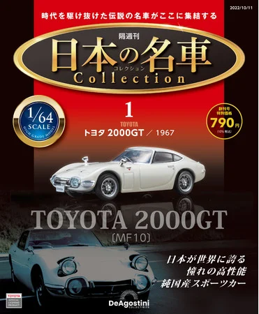 集めやすい1/64スケールで統一された日本の名車がコレクションできるシリーズはパートワーク初。細部まで精巧につくられた重厚感あふれるハイクオリティ・ダイキャストモデルがラインナップします。
