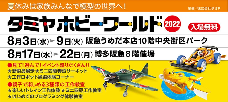株式会社タミヤは2022年8月3日、タミヤホビーワールド2022 in 大阪 / タミヤホビーワールド2022 in 福岡 開催詳細ページを更新した。