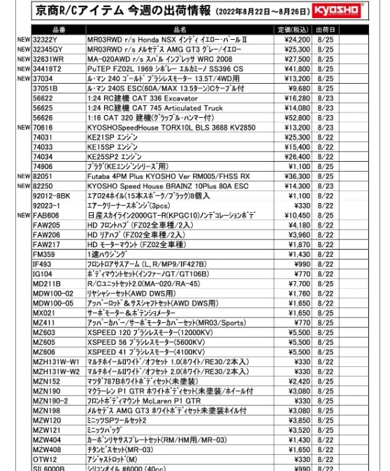京商株式会社は「今週の出荷情報(2022年8月22日~8月26日)」 を発表いたしました。