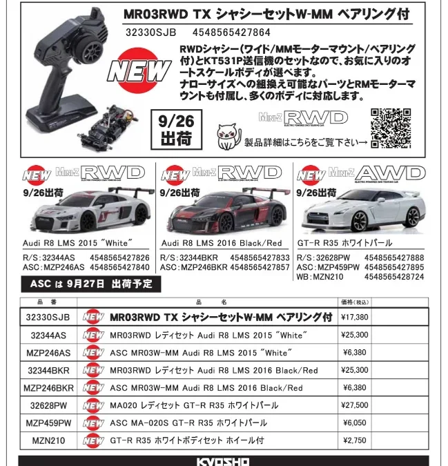 京商株式会社は「ミニッツ MR-03RWD シャシー・送信機セット & 各種レディセット 新登場!」 を発表いたしました。