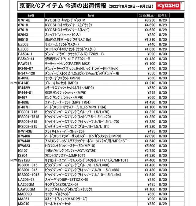 KYOSHO RC Information 今週の出荷情報(2022年8月29日~9月2日)