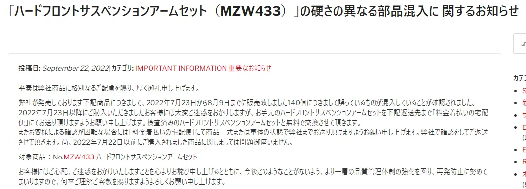 京商株式会社は2022年9月22日に「「ハードフロントサスペンションアームセット(MZW433)」の硬さの異なる部品混入に関するお知らせ」を同社ウェブサイトに掲載いたしました。