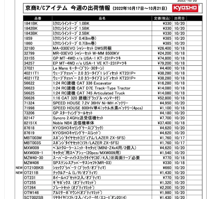 京商株式会社は「今週の出荷情報(2022年10月17日~10月21日)」 を発表いたしました。