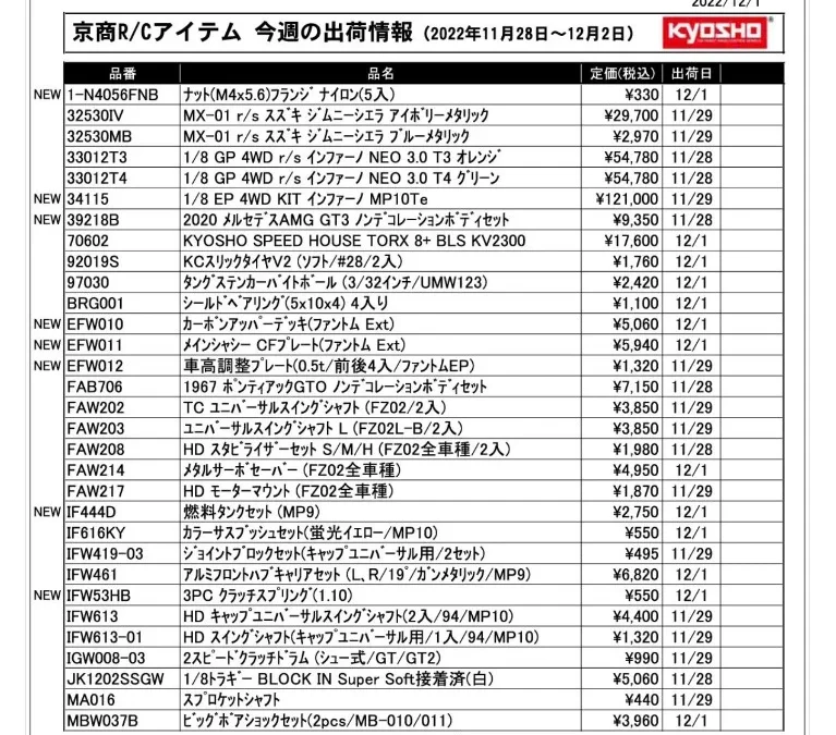 京商株式会社は「今週の出荷情報(2022年(2022年11月28日~12月2日)」 を発表いたしました。