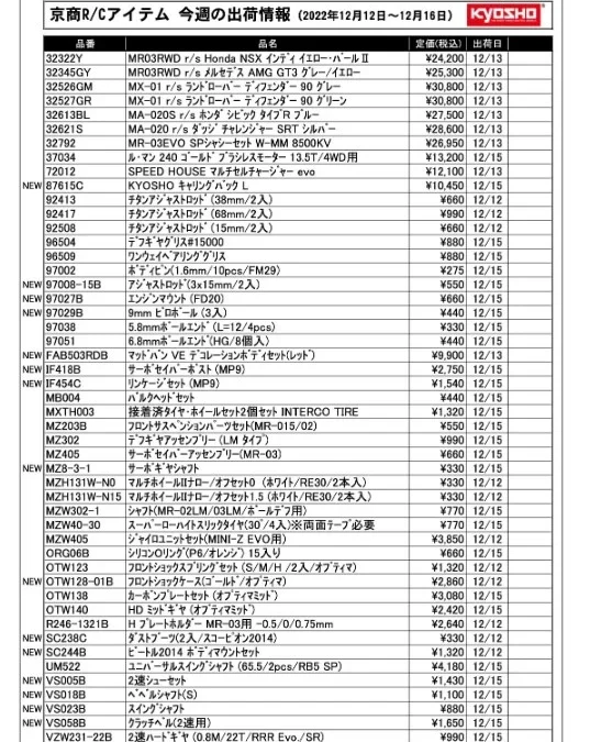 京商株式会社は「今週の出荷情報(2022年12月12日~12月16日)」 を発表いたしました。