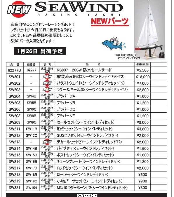 京商株式会社はレーシングヨット シーウインド用 スペアパーツ (品番・価格変更も含む)」の発売を発表いたしました。
