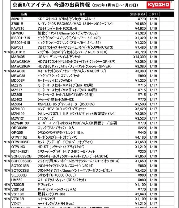 京商株式会社は「今週の出荷情報(2023年1月16日~1月20日)」 を発表いたしました。