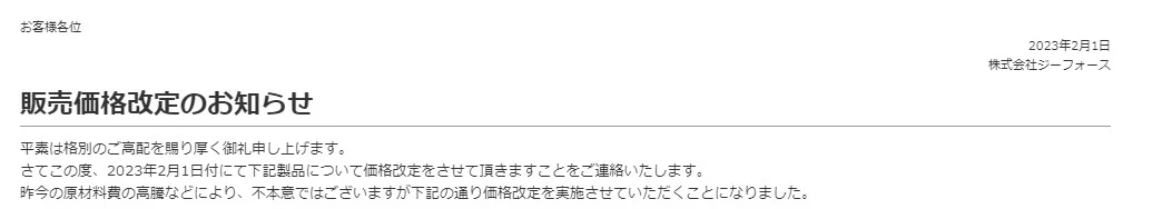 株式会社ジーフォースは2023年2月1日、販売価格改定のお知らせを同社Webサイトに掲載した。
