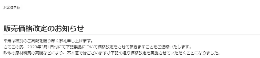 販売価格改定のお知らせ:
