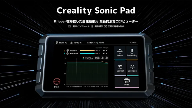Klipperソフトウェアを搭載した革新的演算コンピューター。高度な演算による造形時間の短縮で、同じプリンター・同じスライスデータでの印刷でも造形速度が大きく向上。接続はUSBケーブルで市販されている多くのFDM方式の3Dプリンターに接続することが可能となっており、Creality社の22種のプリンターは設定がプリインストールされている。1台のSonic Padで4台のプリンターの同時制御が可能。