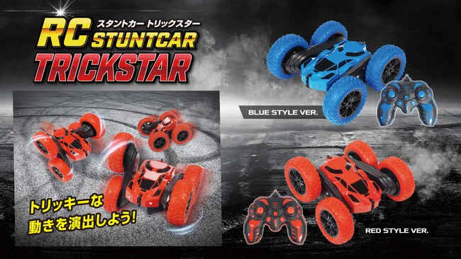「RCスタントカー トリックスター」はスピンアクションが楽しい新感覚ラジコン。 走行時のライト点灯やオート走行機能も搭載でアクロバット走行を簡単に実現。ブルーとレッドの2色展開。