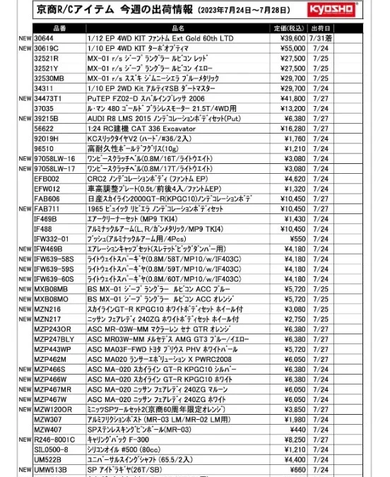 京商株式会社は「今週の出荷情報(2023年7月24日~7月28日)」 を発表いたしました。