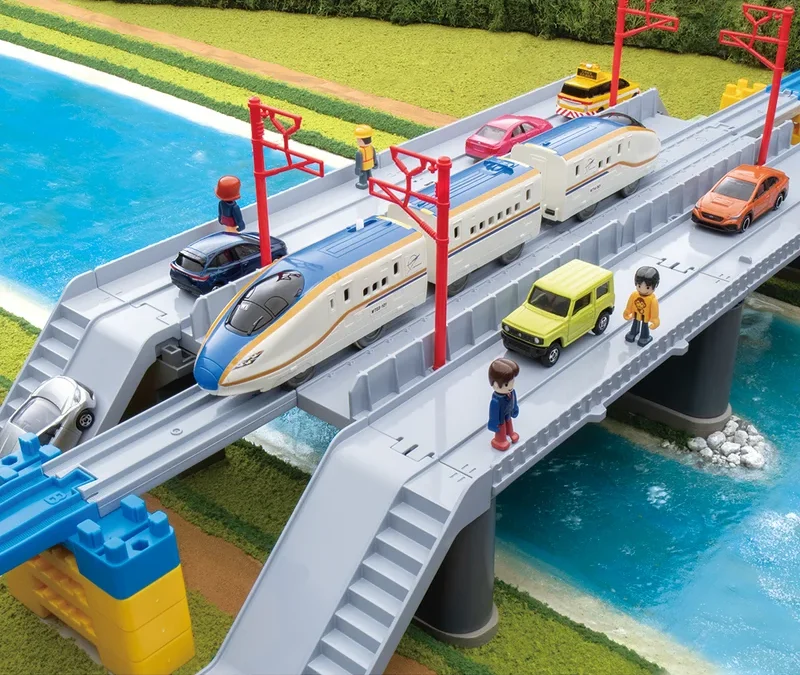 情景パーツには日本初の新幹線と道路の併用橋「新九頭竜橋」モチーフの橋が付属し、本商品とトミカ(別売り)を一緒に遊ぶことで新幹線と車が並走する話題のシーンを再現することが可能。橋は組み立て式のため、3種類のレイアウトが組めるようになっている。