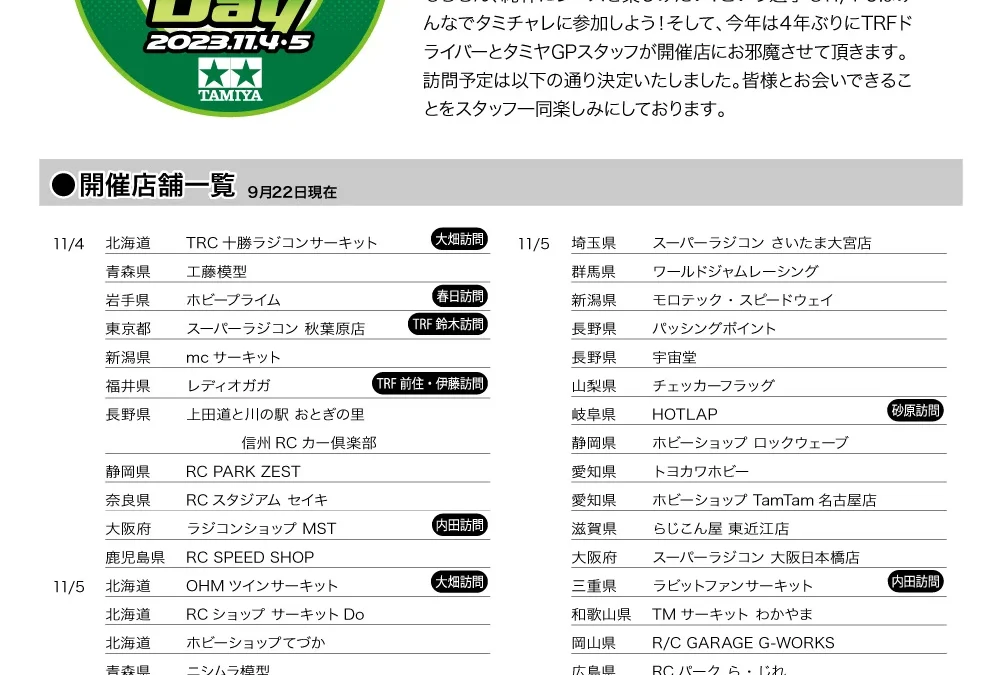株式会社タミヤは2023年11月4日、5日に「全国統一タミチャレの日」を開催することを発表した。