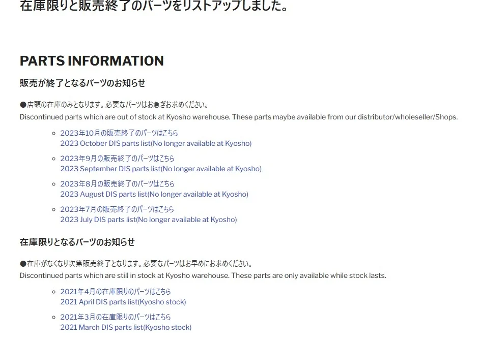 京商株式会社は2023年10月18日に在庫限りと販売終了のパーツリストを同社ウェブサイトに掲載いたしました。