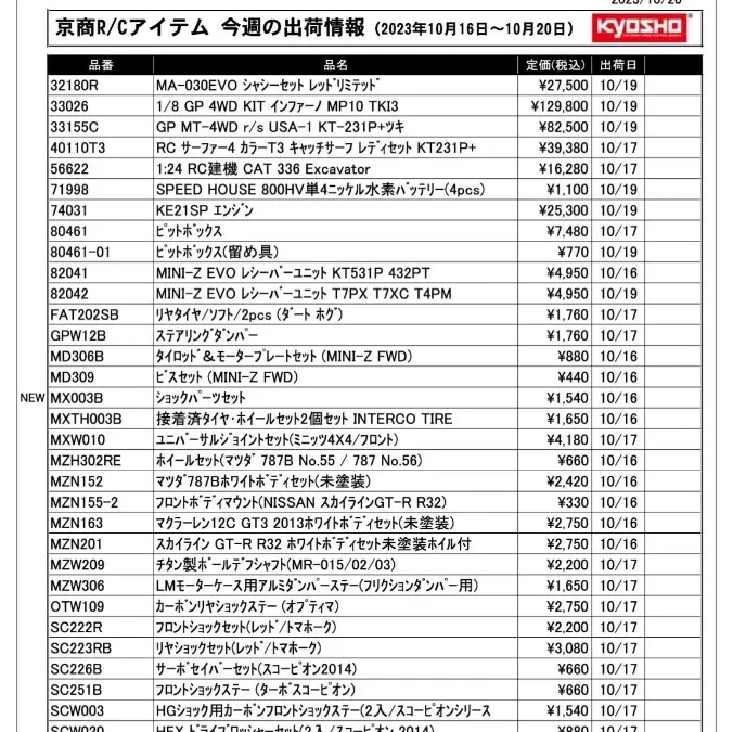 京商株式会社は「今週の出荷情報(2023年10月16日~10月20日)」を発表いたしました。
