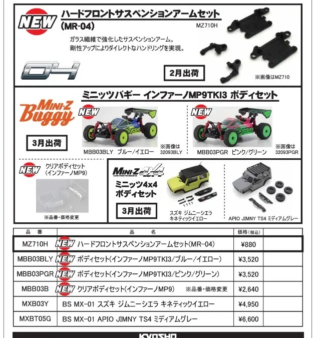 KYOSHO RC Information ミニッツ MR-04用ハードフロントサスペンションアーム & バギー用ボディを発表
