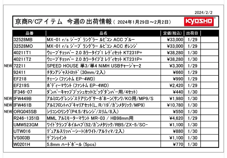 京商株式会社は「今週の出荷情報2024年1月29日~2月2日)」を発表いたしました。