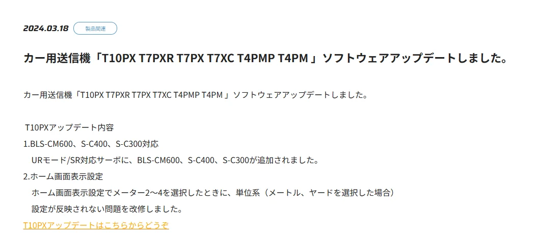 カー用送信機「T10PX T7PXR T7PX T7XC T4PMP T4PM 」ソフトウェアアップデートしました。