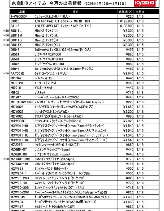 京商株式会社は「今週の出荷情報(2024年4月15日~4月19日)」を発表いたしました。