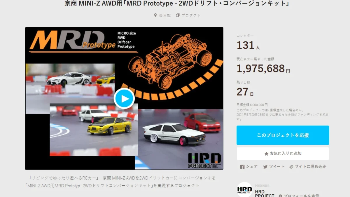「プロトタイプからユーザーと共にラジコンカーを創り上げる」をコンセプトとしたプロジェクト「HRD PROJECT」が開催中の”京商 MINI-Z AWD用「MRD Prototype – 2WDドリフト・コンバージョンキット」”クラウドファンディングの進捗状況を発表した。