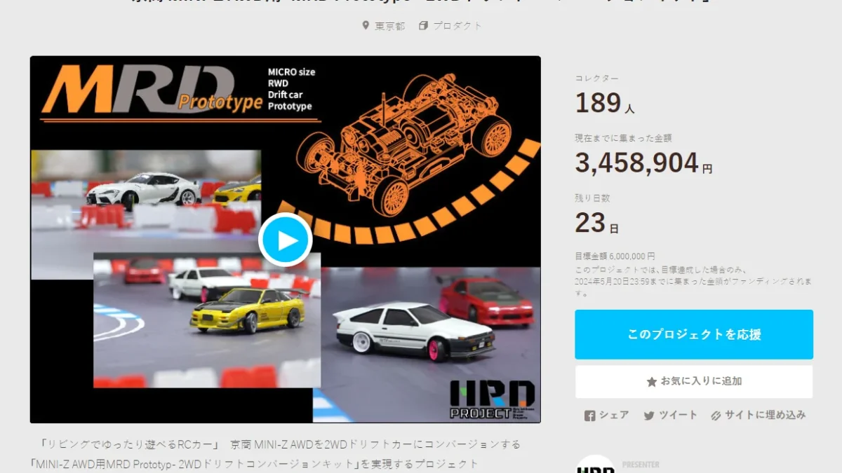 「プロトタイプからユーザーと共にラジコンカーを創り上げる」をコンセプトとしたプロジェクト「HRD PROJECT」が開催中の”京商 MINI-Z AWD用「MRD Prototype – 2WDドリフト・コンバージョンキット」”クラウドファンディングの進捗状況を発表した。