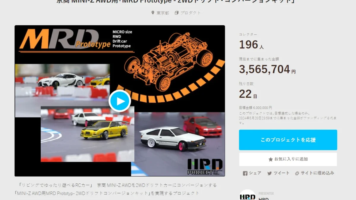 「プロトタイプからユーザーと共にラジコンカーを創り上げる」をコンセプトとしたプロジェクト「HRD PROJECT」が開催中の”京商 MINI-Z AWD用「MRD Prototype – 2WDドリフト・コンバージョンキット」”クラウドファンディングの進捗状況を発表した。
