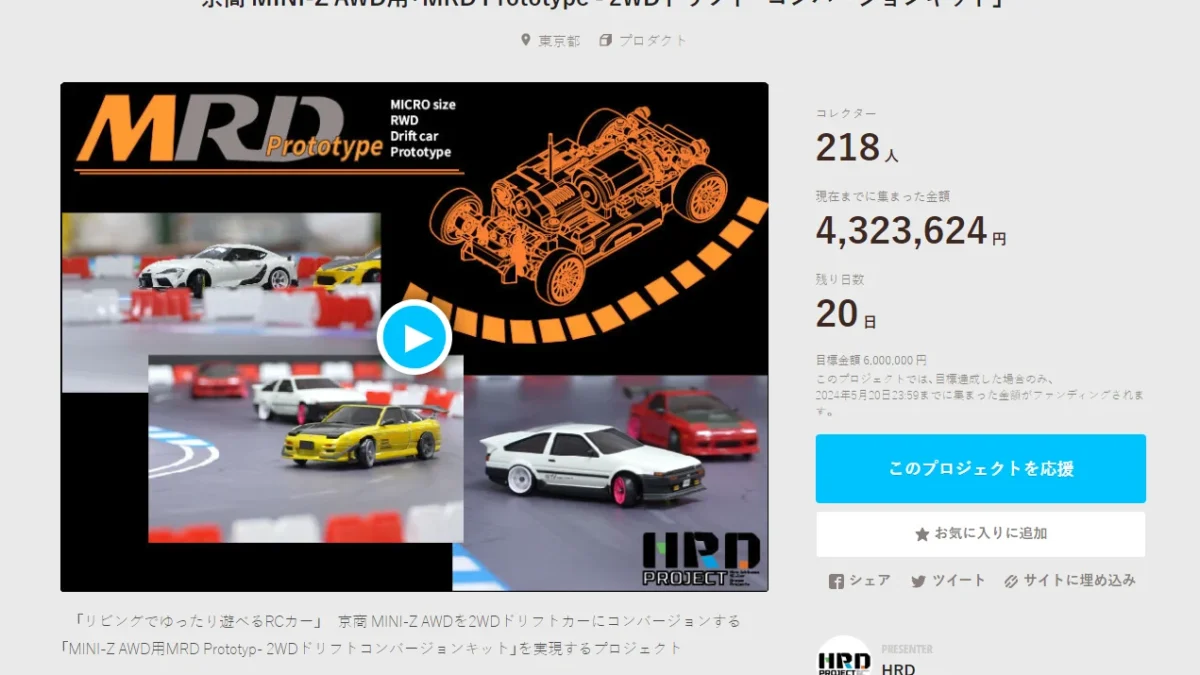 「プロトタイプからユーザーと共にラジコンカーを創り上げる」をコンセプトとしたプロジェクト「HRD PROJECT」が開催中の”京商 MINI-Z AWD用「MRD Prototype – 2WDドリフト・コンバージョンキット」”クラウドファンディングの進捗状況を発表した。
