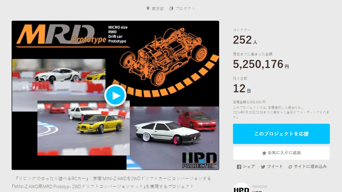 「プロトタイプからユーザーと共にラジコンカーを創り上げる」をコンセプトとしたプロジェクト「HRD PROJECT」が開催中の”京商 MINI-Z AWD用「MRD Prototype – 2WDドリフト・コンバージョンキット」”クラウドファンディングの進捗状況を発表した。
