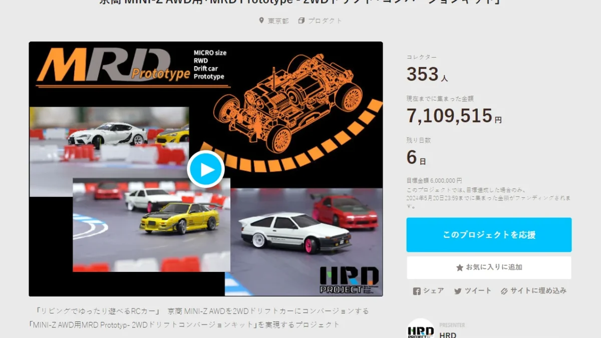「プロトタイプからユーザーと共にラジコンカーを創り上げる」をコンセプトとしたプロジェクト「HRD PROJECT」が開催中の”京商 MINI-Z AWD用「MRD Prototype – 2WDドリフト・コンバージョンキット」”クラウドファンディングの進捗状況を発表した。