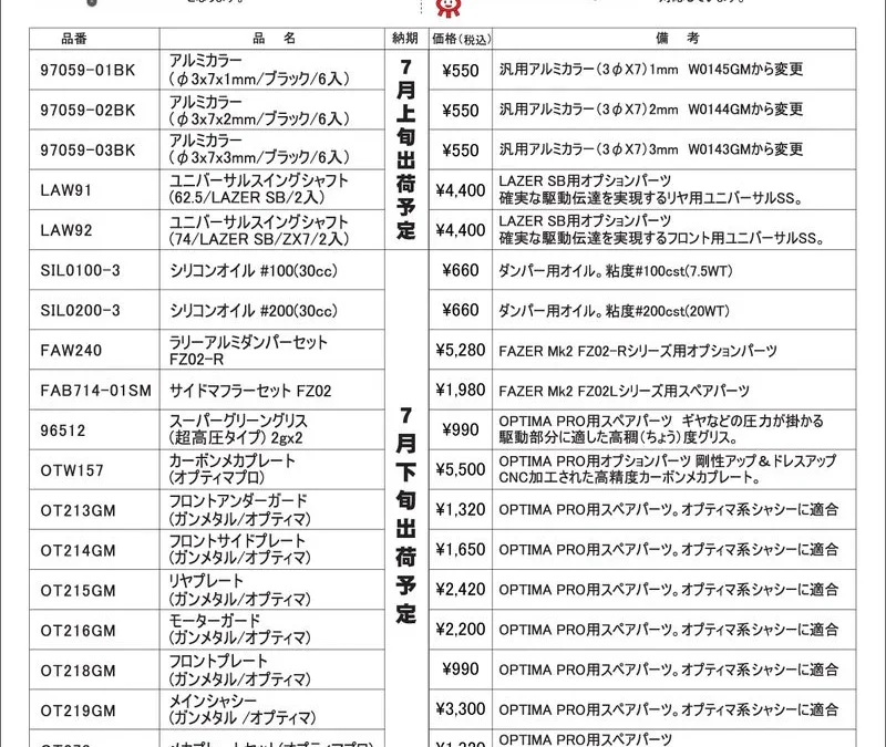 京商株式会社はOPTIMAプロ / FAZER / ダートクロス / 汎用 パーツ各種を発表しました。