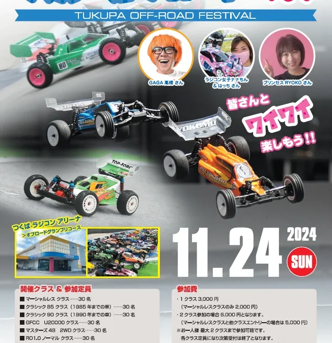 2024年11月24日(日)につくばRC(ラジコン)パークのオフロードグランプリコースで開催されるレースイベント。7クラスが設定され、各クラス30名の定員となっている。参加費が必要。当日はゲストも来場する。
